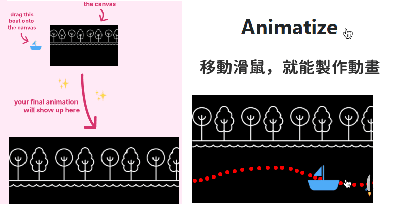 Animatize用滑鼠移動製作動畫的線上免費工具,上傳背景圖片和想要移動的素材,直接用滑鼠描繪出移動路線,簡單的動畫就產生了!將產生的程式碼貼到你的網站中,即可展示動畫,或者把動畫錄影儲存成GIF動圖。