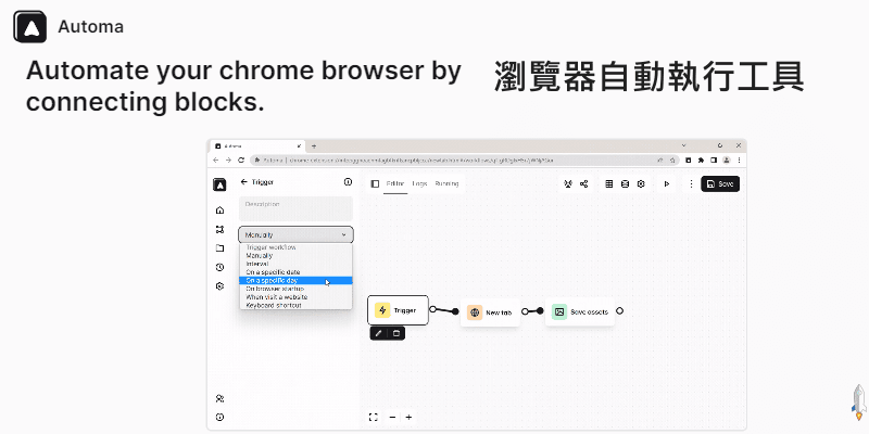 Automa瀏覽器自動化執行工具(Chrome),可設定自動開啟網頁截圖、自動填寫網路上的表單、自動下載圖片、自動點擊某個按鈕、自動過濾/搜尋關鍵字、執行重複任務、在每天或每次訪問某個網站時自動執行想要的工作、跳過YouTube廣告…等等。超強自動化神器,無論是想要搶票刷網頁,還是各種任務通通都能自訂腳本。