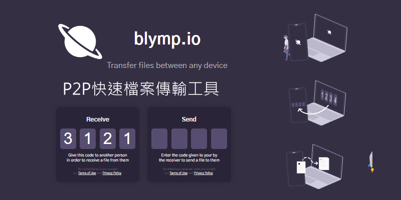 blymp.io免費的線上P2P快速檔案傳輸工具,免安裝軟體、免註冊,只要電腦或行動裝置(Android、iOS)同時開啟網頁,並輸入取得的配對碼,完成配對後即可傳送文件,無傳輸的數量和大小限制,方便共享手機/PC的檔案、影片、照片、音樂和互傳各種檔案。