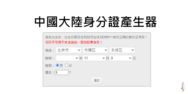 中國大陸身分證產生器,在網路虛擬的世界,如果要註冊帳號或玩遊戲,需要使用到中國身分證字號的話,可以用線上免費的中國大陸身分證產生器,輸入性別、出生日期、出生地點就可快速隨機產生多組號碼,不過提醒大家,不可用於非法活動,如果是申請比較正式的文件,也不建議使用喔。