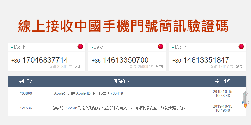 「隱私小號」線上收大陸門號簡訊的免費網站,提供上百組免費的中國大陸手機門號,讓你可以臨時接收簡訊驗證碼,方便註冊相關帳號。不過由於電話號碼是公開的,所有用戶都能在頁面上看到收到的簡訊內容,所以如果是重要的資訊,就不建議使用。