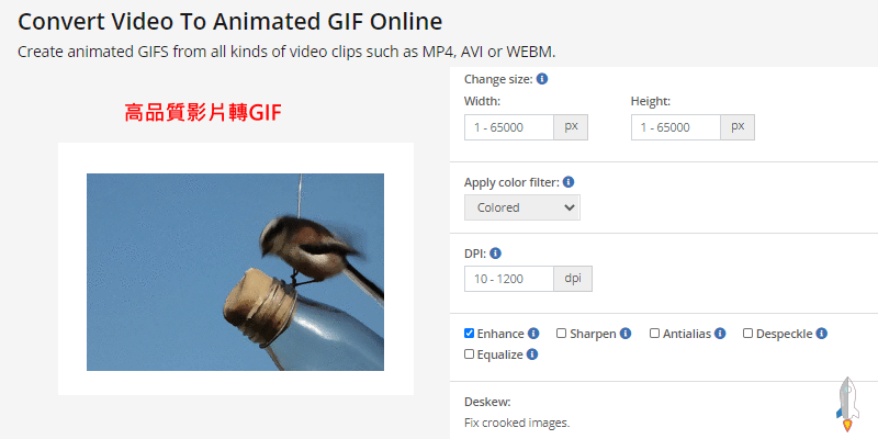 IMG2GO提供的免費線上MP4轉GIF工具(Convert Video To Animated GIF Online),可高品質不失真,將影片轉換為GIF檔,並進階設定轉換後的影像尺寸、銳化、去除鋸齒,讓GIF動圖看起來更平滑和清晰。