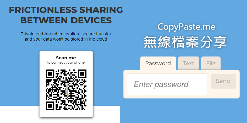 要怎麼才能讓電腦傳檔案到另一台電腦呢?使用CopyPaste.me線上無線傳輸工具,免安裝軟體,只要打開網頁掃瞄QRcode條碼就能輕鬆將檔案/資料或文字傳給另一台電腦、筆電傳給手機、手機傳給手機等等多種設備互傳,在不同網路或沒有傳輸線的時候,用來傳資料超方便。