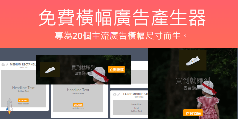 一鍵製作符合20種廣告版位的圖片,電腦版和手機版都適用。300 X 250、336 X 280、160 X 600、728 X 90、320 X 50、自訂廣告大小。