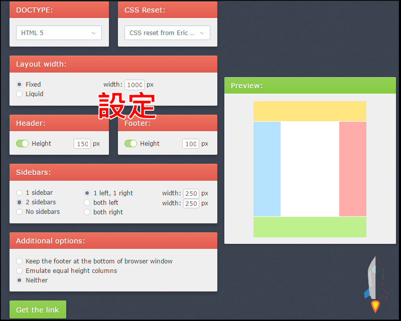 前往CSS Layout Generator,選擇要產生的HTML編寫版本DOCTYPE:HTML5,HTML4;Layout width尺寸大小;Header與Footer的高度;Fixed或Liquid Layout;Sidebars左右側邊欄位數,完成之後點一下Get the link。