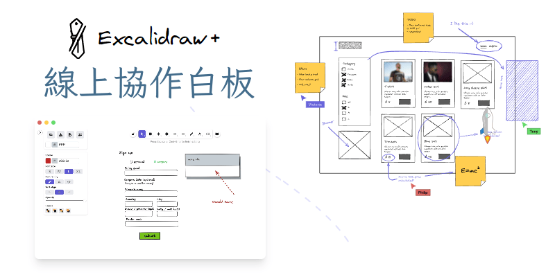 Excalidraw免費線上協作白板,可以任意在畫板上手繪、畫流程圖、組織圖、畫任何插畫、模型圖等,提供即時協作功能,免安裝軟體和註冊,傳送連結就能邀請他人加入共同創作,遠端可視覺化操作,同步查看繪製的流程,方便步驟教學。