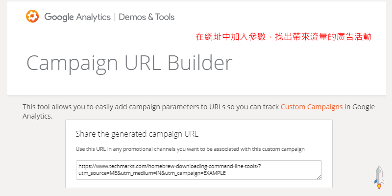 複製下方產生的連結網址,點看看檢查是否有設定成功。(範例:https://www.techmarks.com/?utm_source=ME&utm_medium=IN&utm_campaign=EXAMPLE)