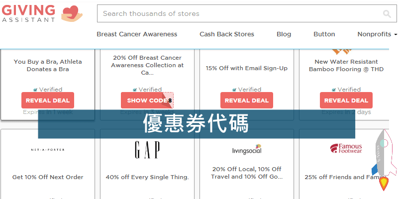 Giving Assistant提供了各種產品優惠券代碼Coupon,無論是購買軟體(Microsoft Office,影音編輯程式,)、網路購物(GAP,FOREVER21,Adidas)、訂房網站(Hotels.com,Agoda,Airbnb,Booking)、伺服器(Bluehost,GoDaddy)、機票等等都能從網站上搜尋折扣序號,在消費之前,不妨先從網站上搜尋看看有沒有相關的優惠折價序號吧。