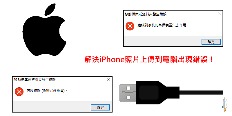 用USB傳輸線將iPhone照片/影片上傳到Windows電腦時,出現「移動檔案或資料夾發生錯誤」、「連結到系統的某個裝置失去作用」或是「資料錯誤(循環冗於檢查)」等等的提示,其實是因為新版iPhone因為照片格式HEIC,要傳送到電腦必須經過轉檔JPG,所以當容量太大就容易會造成中斷。以下為解決辦法教學。