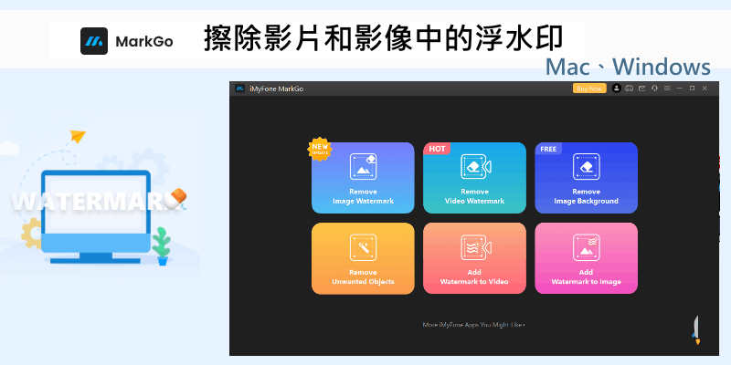 iMyFone MarkGo 去除影像浮水印(Mac)、iMyFone MarkGo 去除影像浮水印(Windows),包含多種功能:AI智慧自動去除影片和圖片的浮水印、添加浮水印、照片去背、去除照片物件等。