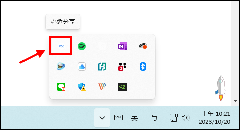 要怎麼讓電腦和手機透過「鄰近分享」功能,接收和傳送檔案?請在電腦下載Nearby Share for Windows。接著點右下角開啟「鄰近分享」畫面。