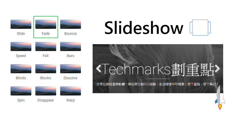 設定切換圖片時的轉場效果,滑動、百葉窗、翻動、彈跳、浮動…多達18種特效。