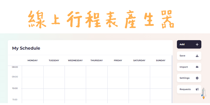 Free Online Schedule Maker介紹兩個好用的線上行程表產生器,快速製作每日的日程表、安排每週行程或製作課程表、工作輪班表、假期規劃表、幾點幾分才藝課、幾點幾分上課、幾點幾分寫作業等等等,還能自訂背景圖片和文字的顏色,客製化有質感的行程表。
