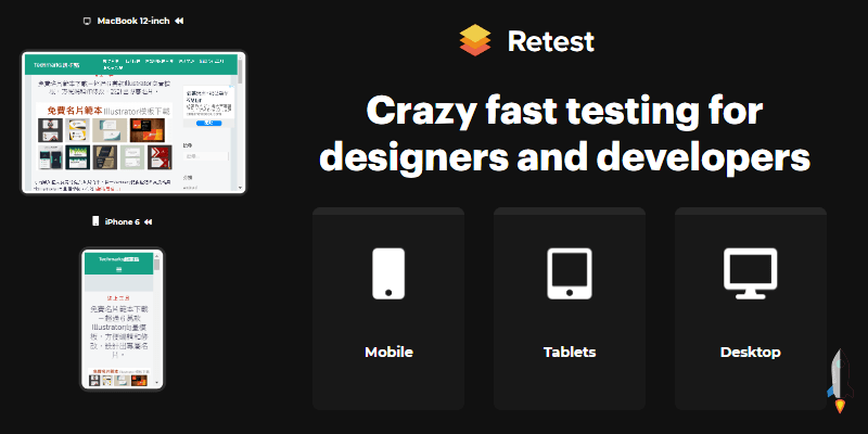 Retest免費線上工具,檢查網站在各手機(iPhone,Samsung,小米,華為)、平板(Apple,Nexus,Xperia)、不同電腦系統(Apple,DELL,HP,Asus)看起來的樣子。在開發網站時,就能先用來測試廣告、Javascript是否能在每個設備正常顯示,或是鍵盤可否正常輸入、介面是否有跑版等。