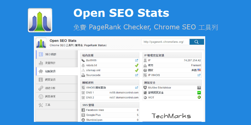 今天要介紹Open SEO Stats這款Chrome擴充外掛,是一個相當強大的SEO優化工具,包含流量分析、緩存、網頁速度、外鏈數、SNS 營銷、連結數據分析、頁面收錄統計和各大瀏覽器的PageRank(PR)的排名外,還能查詢IP的所在位置與網站的伺服器技術,相當不錯的SEO整合工具。