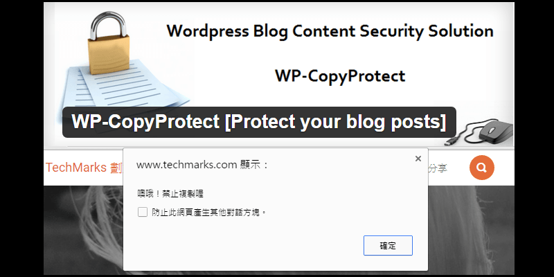 【WordPress】CopyProtect鎖右鍵外掛,禁止他人複製文章 WP-CopyProtect是一個可以保護部落格文章不被複製的WordPress外掛,鎖住右鍵讓其他使用者無法拷貝和防止盜用內容,還能自訂禁止複製的警告彈出訊息框。 [Protect your blog posts] 閱讀更多