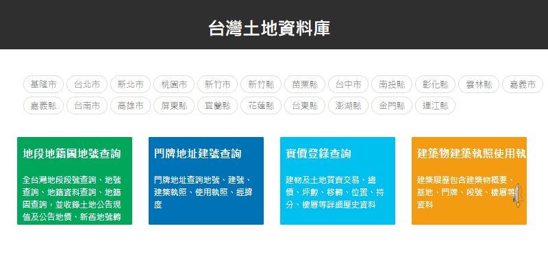 台灣土地資料庫,整合了多種土地和建築物資訊,可以用來線上查詢土地地段地號、門牌地址查詢建號地號、實價登錄、建築執照使用執照、房屋的交易紀錄、土地持分、建築物使用分區和面積等等,方便迅速掌握土地的所有資訊。