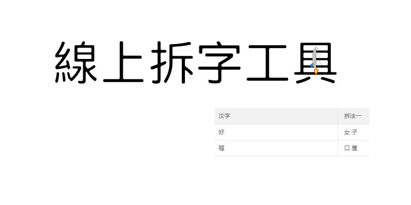 Home » 線上工具 » 線上拆字工具,輸入中文字把它們都像這樣扌斥 扌卓 線上拆字工具,輸入中文字把它們都像這樣扌斥 扌卓 線上拆字工具,只要在方框內輸入文字,如果是可以拆解的就會被拆開,就像 辶 言 木 羕 扌斥 扌 卓,把部首和組合的單字分開,不過其實也沒什麼用意XD,好玩用。 由此前往:線上拆字工具 線上拆字 STEP1 前往線上拆字工具,在方框內輸入文字,並選擇「繁體中文」。 STEP2 有各種拆法,可挑選喜歡的拆字,直接複製。 ◉文言文和白話文互轉:線上文言文翻譯工具 ◉把字藏在詩裡:藏頭詩產生器 ◉練字必備:生字簿產生器 相關文章: 線上文言文翻譯工具-把文言文轉成白話文、白話文轉文言文 【藏頭詩產生器】線上快速製作-生日祝福、告白、放入姓名 Burn After Reading 線上閱後即焚-分享只給看1次的文字和照片 是台灣口音!免費【線上文字轉語音】工具,接近真人口吻 線上中國大陸身分證產生器-隨機產生多組正確的身分證字號 Long Text To Image線上「文字轉圖片」-可自訂背景圖,免費高清下載。 官方最新 Windows11 繁體中文版|ISO光碟映像檔下載 線上羅馬數字轉換器-阿拉伯數字&羅馬字對照表!學會怎麼寫羅馬數字I=1,V=5,X=10。
